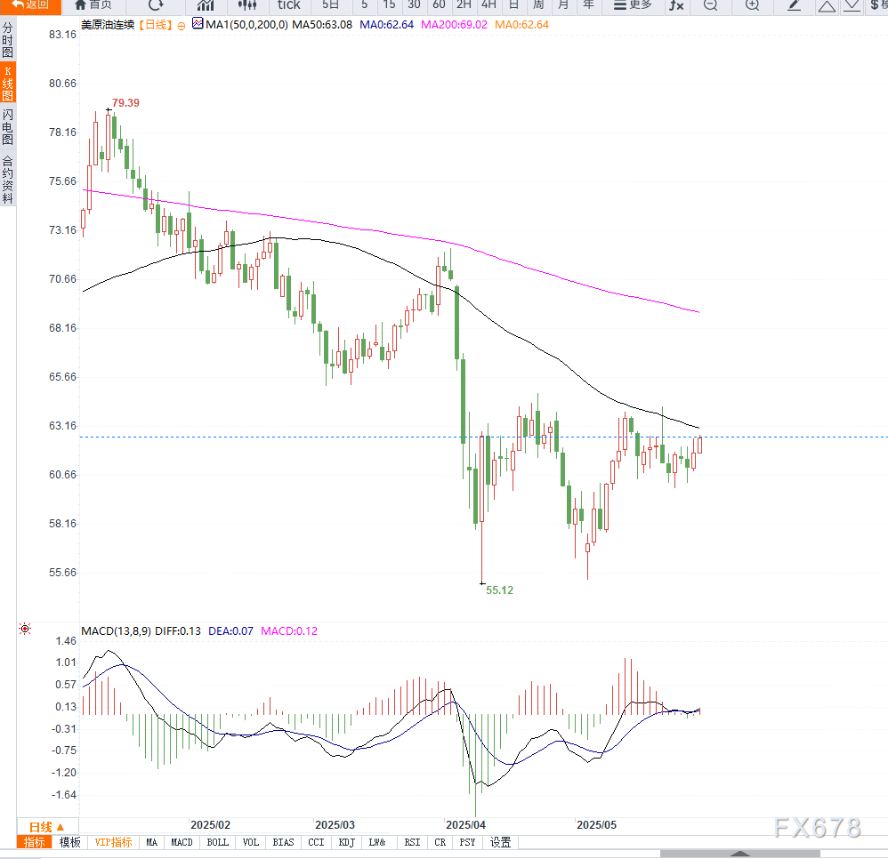 尽管市场情绪回暖,但分析师指出,这种缓解或为短暂,因为美方计划对此裁决提出上诉。   与此同时,市场正密切关注可能出台的新一轮美国对俄罗斯原油出口的限制。尽管目前俄油整体表现出对制裁的抗压能力,   澳大利亚联邦银行分析师Vivek Dhar表示:“很难相信任何新的美国制裁将显著削弱俄罗斯的石油出口。”   本周六,石油输出国组织及其盟友(OPEC+)预计将召开会议,可能决定在7月加快增产步伐。   供应风险方面,美国总统特朗普政府3月撤销雪佛龙在委内瑞拉的关键许可证后,该公司已停止石油生产和相关活动。   4月份,委内瑞拉因付款问题取消了向雪佛龙的油轮发货,该公司原本每日出口29万桶委内瑞拉石油,占该国总出口三分之一以上。   Rystad Energy全球大宗商品市场负责人Mukesh Sahdev指出:“从5月至8月,液体燃料需求预计将超过供应,市场呈现建设性的看涨趋势。”   市场还关注周四将公布的美国石油协会(API)和能源信息署(EIA)的周度库存报告。据市场消息人士透露,上周美国原油和汽油库存下降,而蒸馏油库存上升。此前市场普遍预期原油和蒸馏油库存上升,汽油库存下降。   从美原油(WTI)日线图来看,当前价格已突破短期震荡区间上沿,并站稳在60日均线之上,显示出强势反弹迹象。MACD指标形成金叉,红柱持续放大,表明多头动能逐步增强。   若后续能够有效突破63美元关口,将有望上探66美元附近的前期高点支撑位;下方则以60美元作为关键支撑位,一旦失守,短期上涨趋势可能遭遇考验。整体来看,短线走势偏向多头,但需警惕基本面风险变化带来的回调压力。