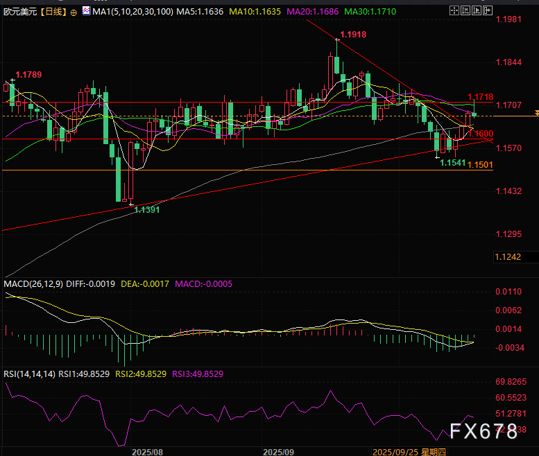 目前受20、30日均线压制,短期重拾了上涨形态,支撑在1.1600和下降压力线上。